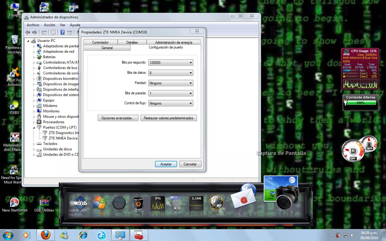 5- Hacemos clik derecho en el primero, le damos clic a propiedades y nos vamos a la segunda pestaña la que dice "Configuración del puerto" Ahi nos vamos a la parte que dice "Bits por segundo" y seleccionamos la mayor o sea 128000 y le damos aceptar.ç
